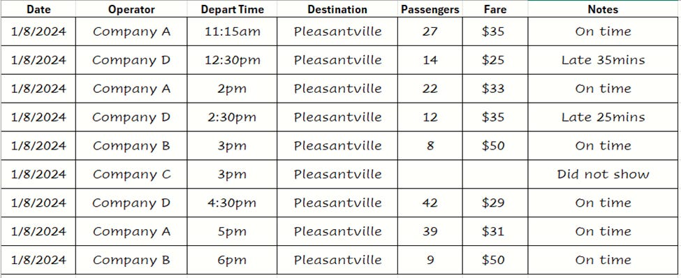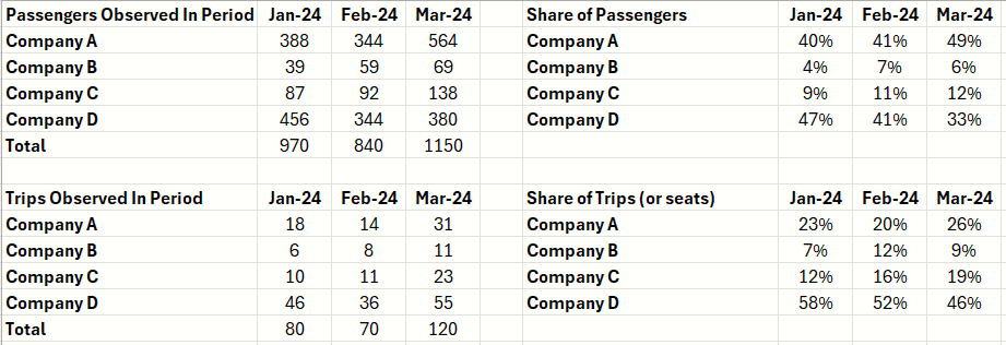 You need to get out and see who you are competing against in your market, how many passengers they're carrying and what the fare levels are like. Here's an example of what can look like: