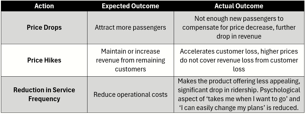 When ridership and revenue drops on scheduled services in competitive markets, the remedies often immediately put on the table are: