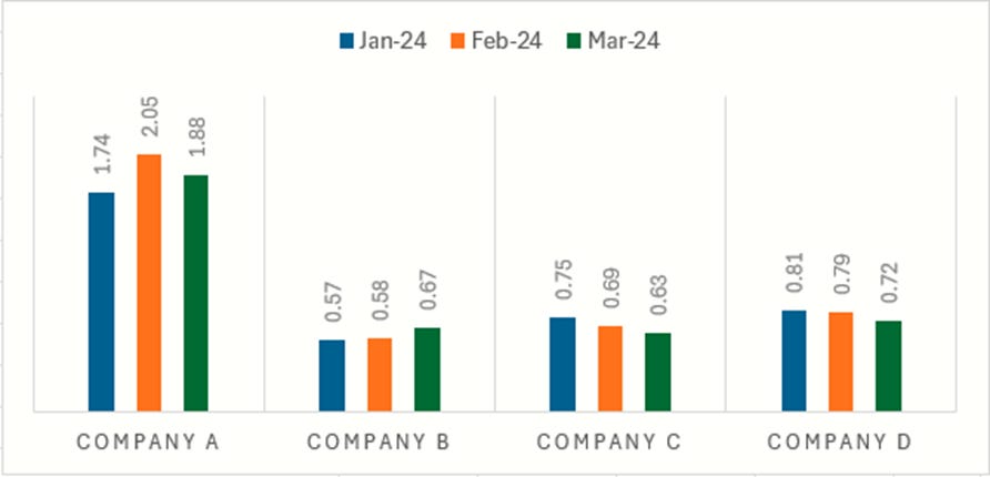 In this example, we’ve been consistently conducting market shares for 3 months in a market. Each color represents an operator in a particular market, of which there are 4 in total. We looked at Jan, Feb and March 2024.