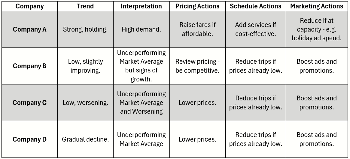 The 4 different companies are experiencing slightly differing trends. Company A may very well choose to do nothing with their information, given their relatively strong position. Companies C and D need to review and act, particularly if they’re not profitable at their current fare levels. Company B is trending in the right direction, albeit slowly, so may also take actions that lean more towards the marketing and pricing end, rather than cut schedules.