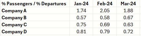 A value greater than 1.0 indicates that you are carrying a higher percentage of passengers compared to the capacity you offer. This suggests that your services are more popular and/or efficient in filling seats than the market average. This is almost always good – assuming your fares are at acceptable contribution levels. You're carrying more than your fair share of supply!