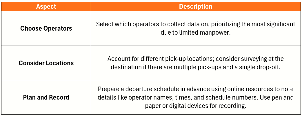 On survey days, you do not want gaps in the days observations. It’s not ok to skip the lunch hour so your data collector can eat – find a way to cover the gap. Consistency is key, and even more so when it comes to comparing one month to the next. The table below summarizes the 'whats' and 'whens':